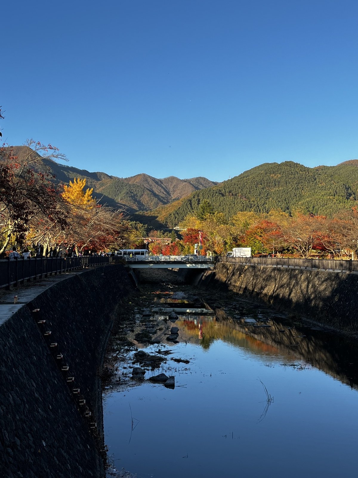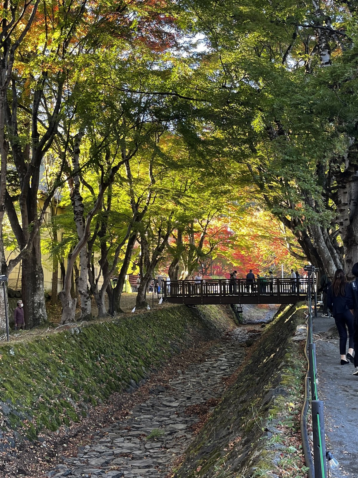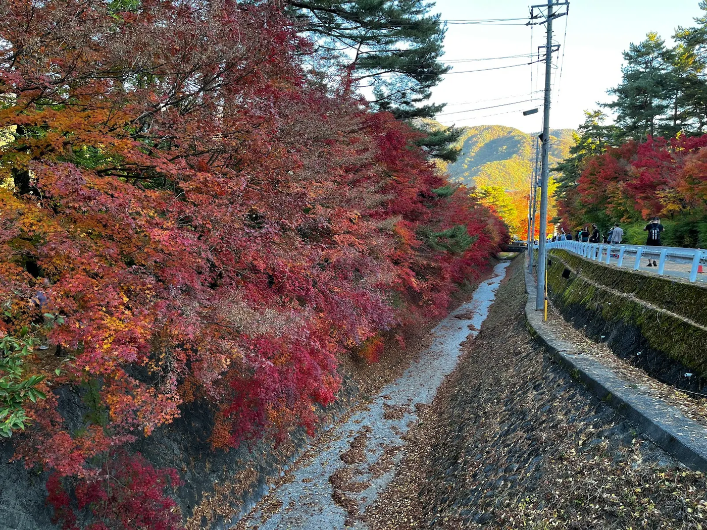 Возле озера Кавагучи специально высажены те самые краснеющие японские клёны. Берега вдоль впадающей в озеро реки даже названы "коридором момидзи". Наверное, тут должно быть очень красиво, в нормальный год с нормальной осенью. Река, кстати, тоже куда-то делась...